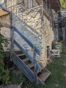 Passend zum Haus gibt es auch die Treppe aus Stein, mit einem nicht normgerechten Geländer aus Naturholz. Aber es passt und erfüllt seinen Zweck. Nur weil die Stufen nicht perfekt aufeinander abgestimmt und das Geländer etwas bucklig ist, stürzen die Benutzer ja nicht reihenweise nach unten. Und das ist so seit hunderten Jahren. Es tut gut, in Zeiten wo wir immer weiter versuchen unser Leben zu regulieren und mit immer neuen Vorschriften zu versehen, dass es Orte gibt, die sind wie sie sind. Und Gott sei Dank kommt auch keiner auf die Idee es zu ändern. Warum auch, es funktioniert doch.