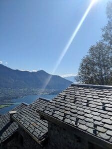 Kurz unterhalb der Alm gibt es das Rifugio Dalco, ein einfaches Hotel in ehemaligen Bauernhäusern. In der typischen einfachen Architektur, gemauert aus einfachen Steinplatten mit einer Dacheindeckung aus ebensolchen Steinplatten, passt es sich perfekt in die Umgebung ein. Obwohl eigentlich geschlossen, hatten wir das Glück, beim Besitzer einen Americano mit Aussicht genießen zu können. Grandios. Aber die Tatsache, dass nicht immer tolles Wetter ist, und dann der Platz so hoch oben auch ziemlich ungemütlich sein kann, hat uns den Augenblick noch mehr genießen lassen.