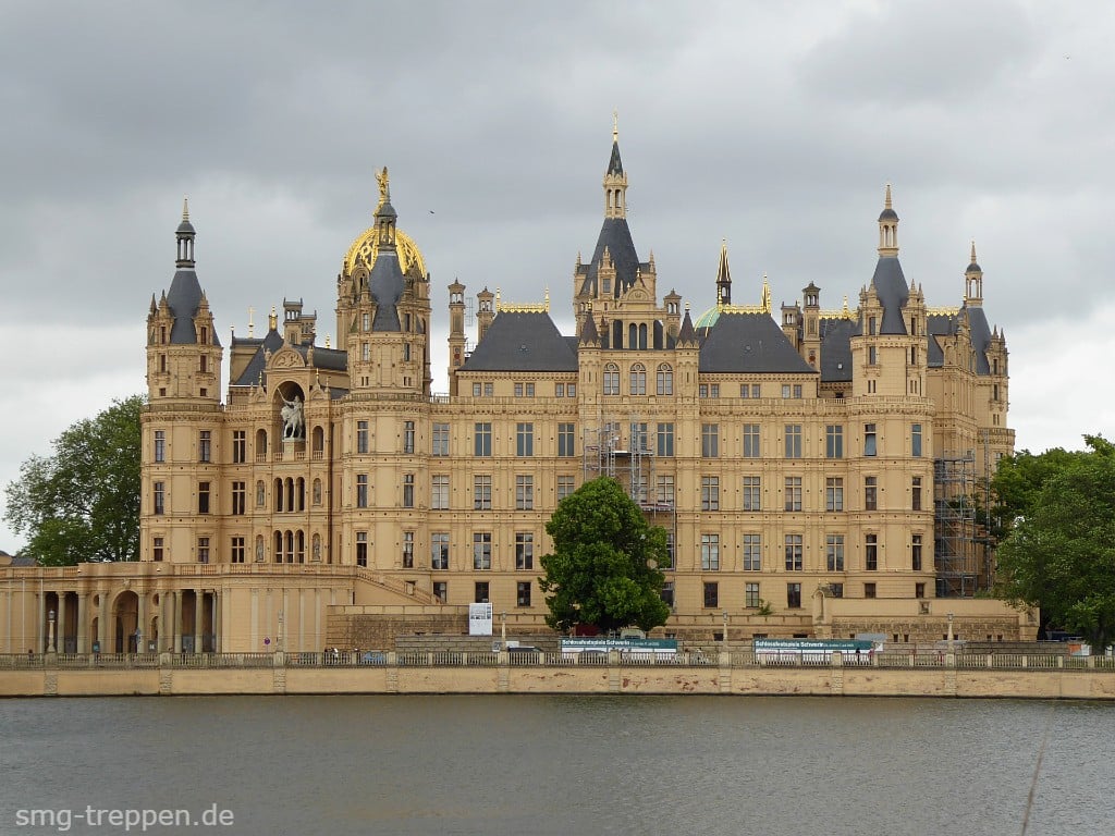 Die Geschichte des Schlosses auf einer Insel im Schweriner See, so wie wir es heute sehen, beginnt 1560 unter Herzog Johann Albrecht I von Mecklenburg-Schwerin. Er beauftragte den Baumeister Johann Parr mit dem Um- und Ausbau nach Vorbildern italienischer Renaissancepaläste. Die letzten 500 Jahre davor war auf der Insel mehr eine Burganlage, die vornehmlich gegen Eindringlinge jeglicher Art Schutz gewähren sollte. Schlösser mit einer solch langen Geschichte sind wirklich nie fertig. Ständig sind Bauarbeiten notwendig, um das Anwesen zu erhalten und den wechselnden Geschmack von Mode, Zeitgeist und den Besitzern zu entsprechen. So verwundert es auch nicht, dass erst 1857 als Fertigstellung unter Großherzog Friedrich Franz II in die Geschichtsbücher geschrieben wurde. Aus Sicht des Jahres 2025 ist das auch nicht korrekt. Seit 1990 ist das Schloss Sitz des Landtages von Mecklenburg-Vorpommern. Auch für diese Nutzung musste das Schloss umfangreich umgestaltet und umgebaut werden.