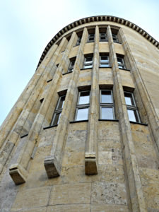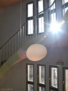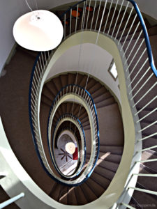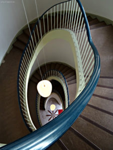 Aber jetzt zum Postkartenmotiv Treppe. Direkt in der abgerundeten Hausecke gelegen, verbindet diese elipsenförmige Treppenanlage alle sechs Etagen des Hauses. Jede Etage 14 Steigungen – Zwischenpodest vor der länglichen Fensterfront – und nochmals 14 Steigungen. Holzwangentreppen mit Tritt- & Setzstufen, verputzte Treppenunterseiten und ein Stabgeländer mit runden Stahlstäben. Schlicht, zeitlos und durch die Form doch sehr elegant. Lediglich das braune Linoleum wirkt befremdlich und paßt nicht wirklich zu der Treppe.