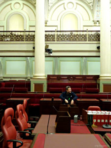 Rosi führte uns durch die heiligen Hallen der Regierung des Staates Victoria. Gleich zu Beginn stimmte Sie uns mit den Worten ein „…Humor ist das einzige, was einem zur Arbeit in diesem ersten Haus motiviert…“ Und sie hielt Wort. Mit einem kurzweiligen, voller Anekdoten und Geschichten gespickten Rundganges durch den großen Ehrensaal, das Ober- und Unterhaus und die Bibliothek ließ sie nur die Frage über den Brexit mit verdrehten Augen unbeantwortet. Zu allen anderen Fragen der buntgemischten Truppe aus unzähligen Ländern hatte sie immer eine Antwort.